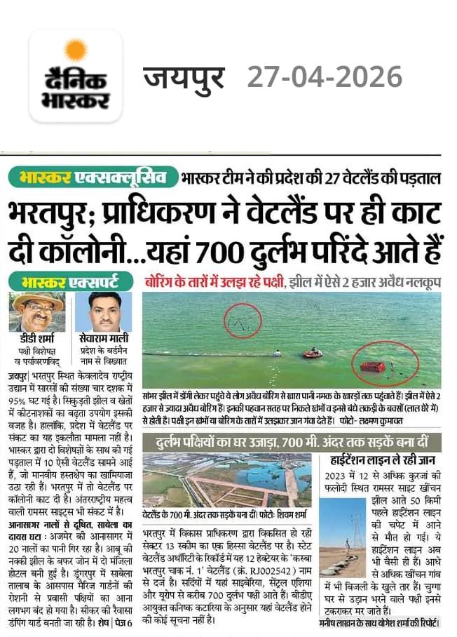 This is a troubling report regarding the environmental degradation of Rajasthan’s wetlands. Below is the transcribed text of the news report from Dainik Bhaskar (Jaipur Edition, 27-04-2026) to make it accessible for site visitors.